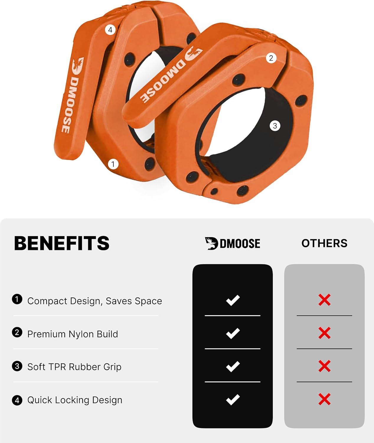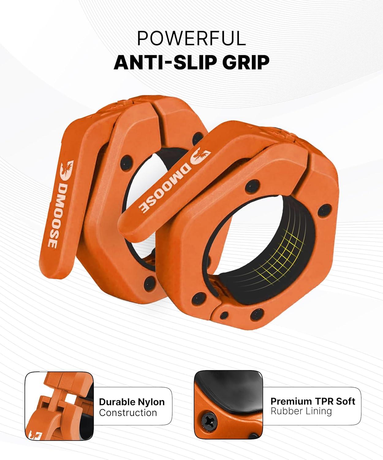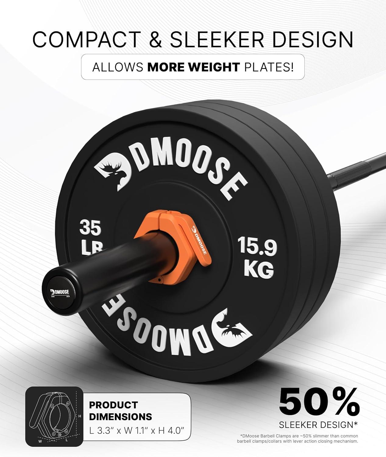 DMoose Fitness Barbell Clips 2 Inch (Pair) – Quick Release Olympic Barbell Clamps & Collars with Anti Slip TPR Grip for Secure Weightlifting and Powerlifting – Weight Clips for Bars at Home or Gym(Orange)