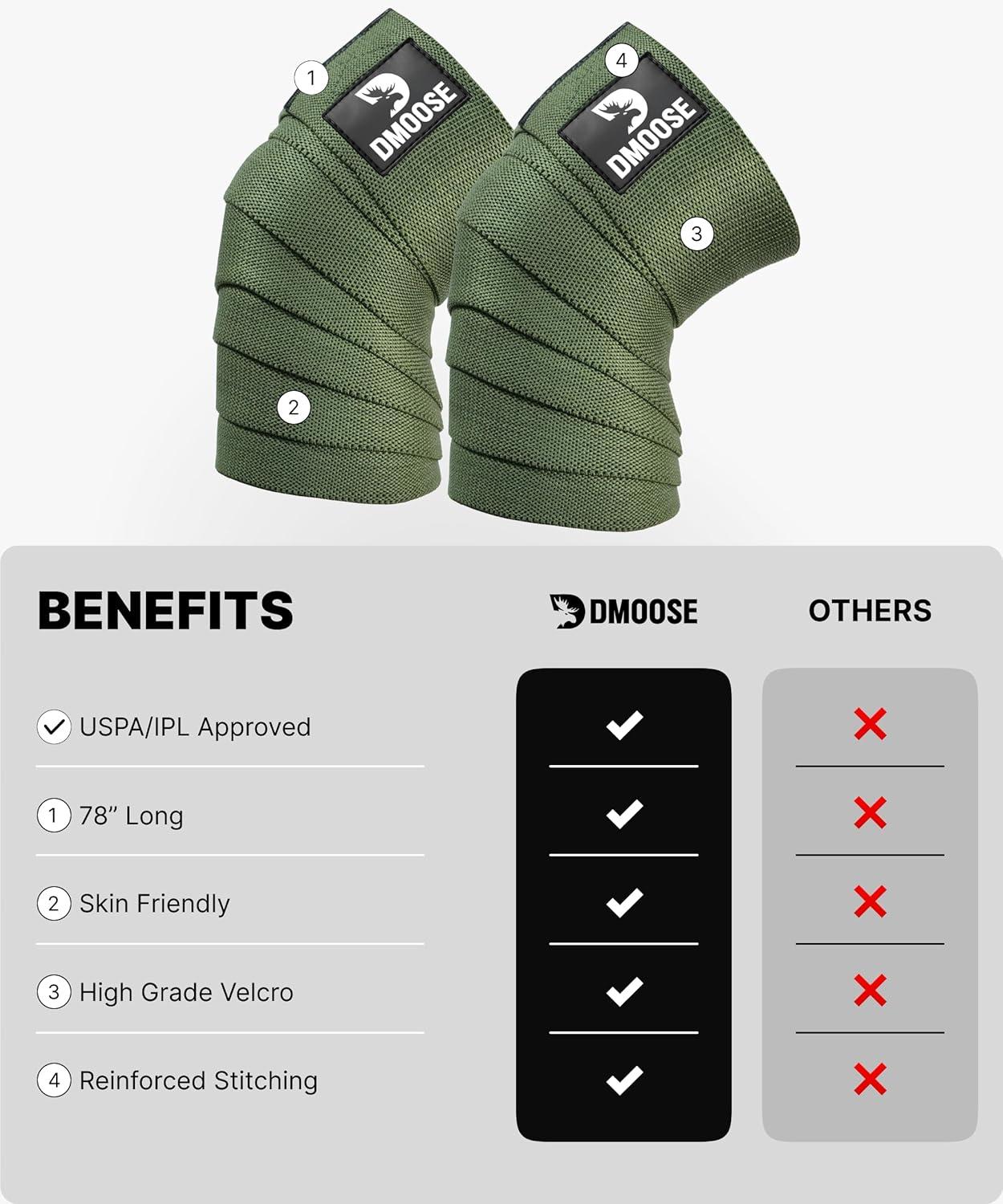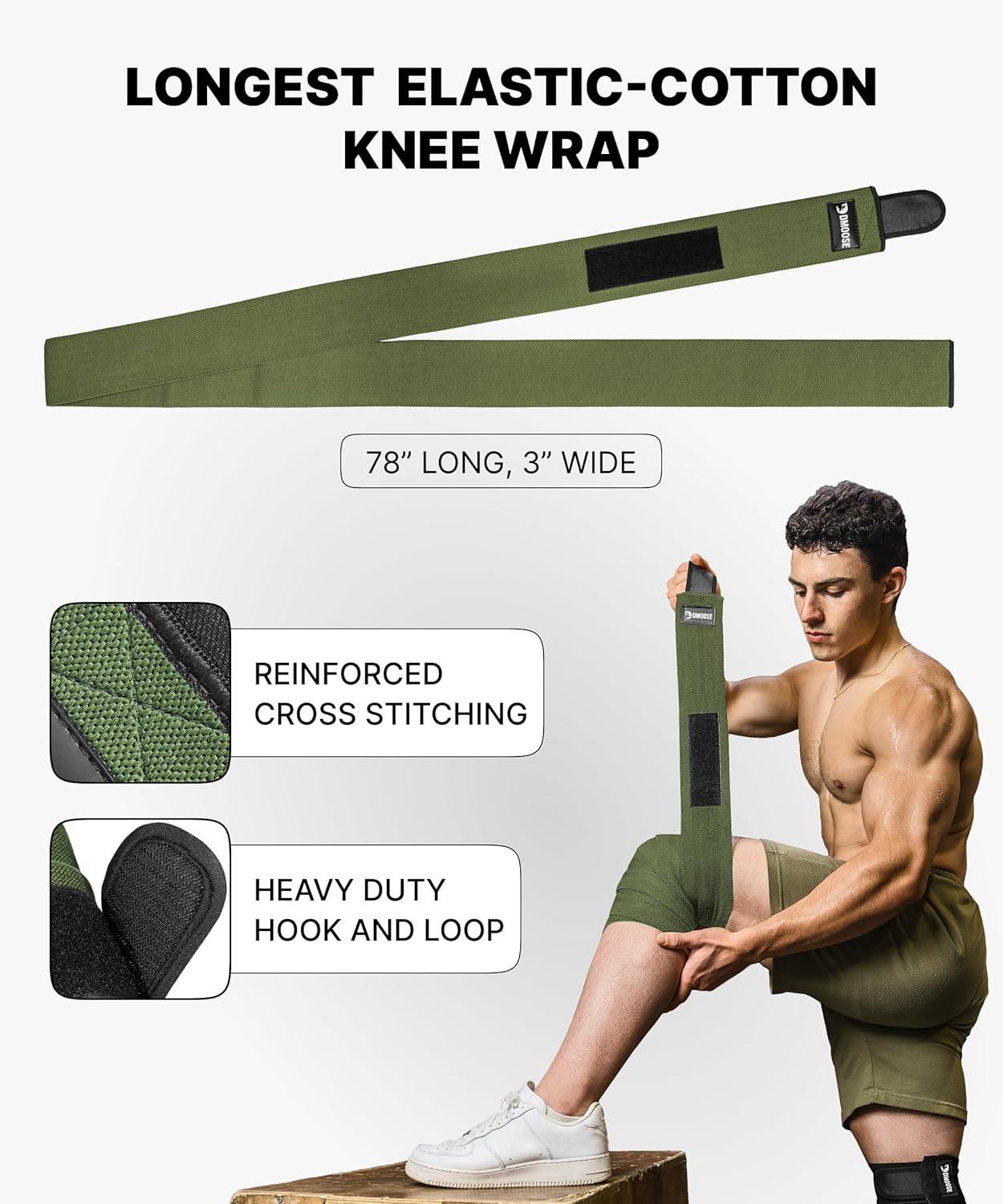 DMoose Fitness Knee Wraps for Weightlifting (Pair) – 78” Gym Brace Straps for Joint Stability & Pain Relief – Perfect for Squats & Working Out – USPA Approved Knee Wrap Supports for Men and Women(Military Green (Pair))