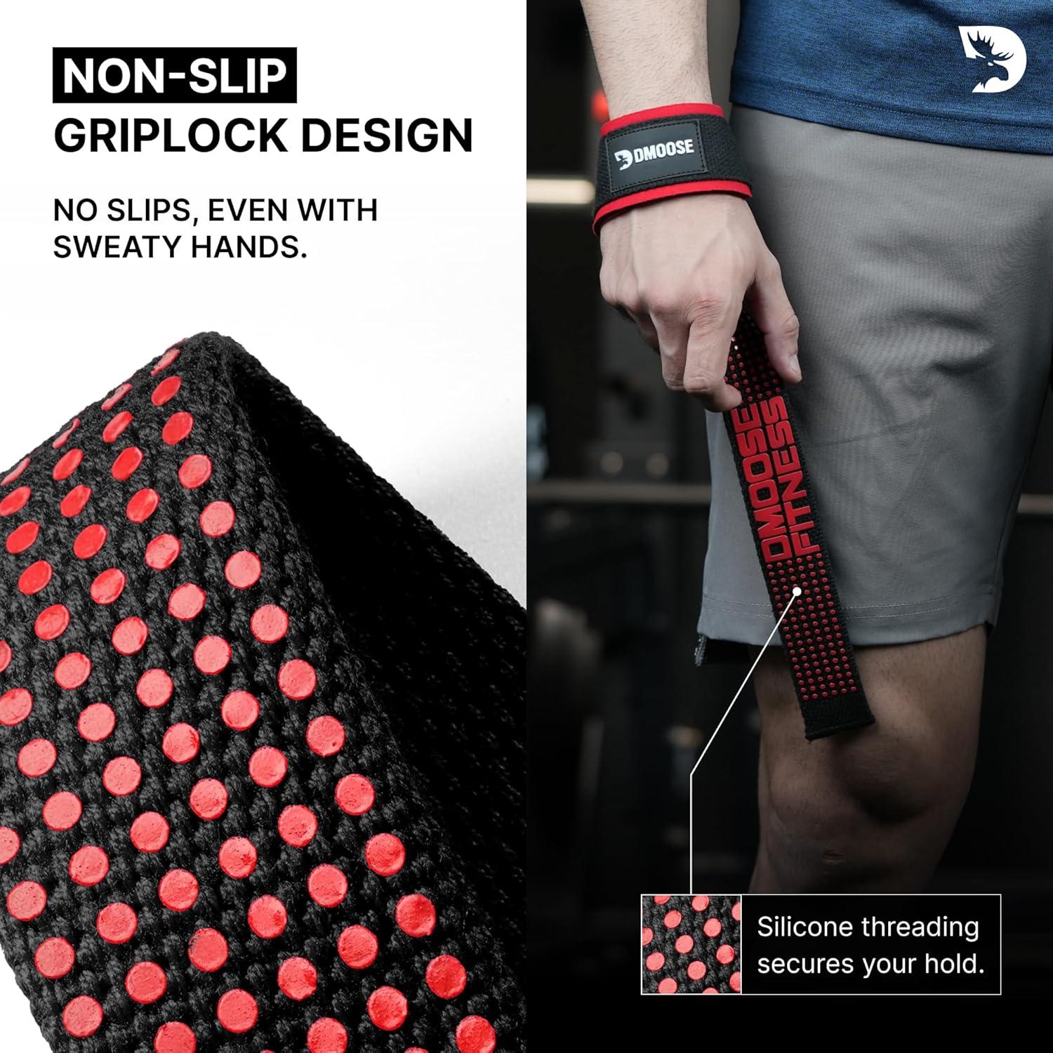 DMoose Fitness Lifting Straps 24″ (Pair) – 5mm Padded Durable Wrist Straps for Weightlifting & Powerlifting – Cotton Lifting Strap with Silicone Grip for Men & Women – Deadlift Strap for Gym Workout(Red Silicon)